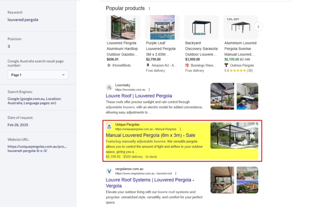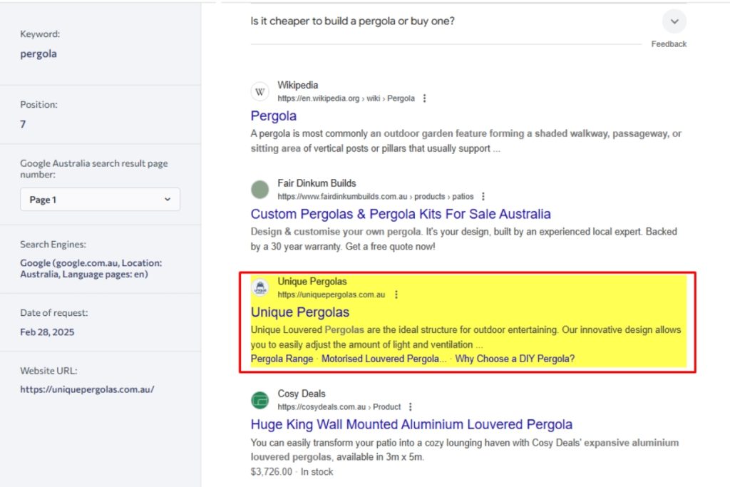By optimising their website for high-intent keywords, improving on-page SEO, and building authoritative backlinks, we’re driving targeted traffic and increasing conversions. Our focus on local SEO ensures Unique Pergolas ranks at the top for pergola solutions in Australia, attracting customers actively searching for premium outdoor structures. With consistent SEO growth, their business is reaching new heights—both online and in sales!